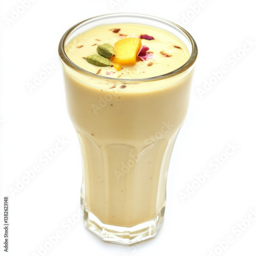 A glass of refreshing lassi, with a creamy yogurt base and a variety of flavors, such as mango, rose, or cardamom, isolated on clean white background.