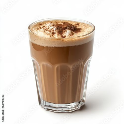 A glass of rich chocolate milk, isolated on a white background, showcasing a sweet and creamy drink