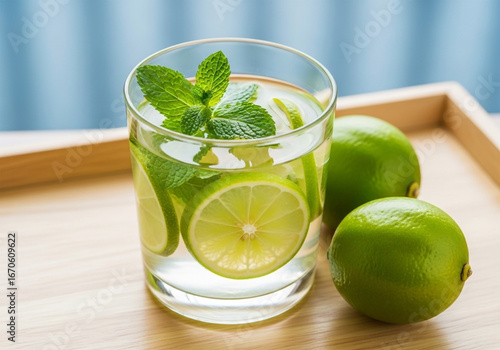 A glass tumbler filled with clear liquid and lime slices, topped with fresh mint leaves