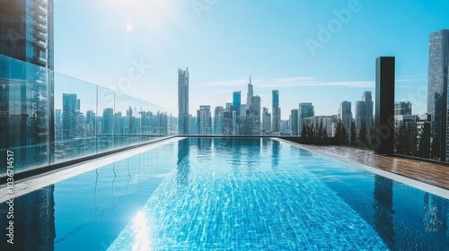A glistening rooftop pool under the sun, with tall urban buildings in the distance on a clear day