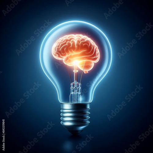 A glowing energy efficient light bulb with a brain as the filament on a dark blue gradient background. The light from brain provides a soft halo effect around the bulb