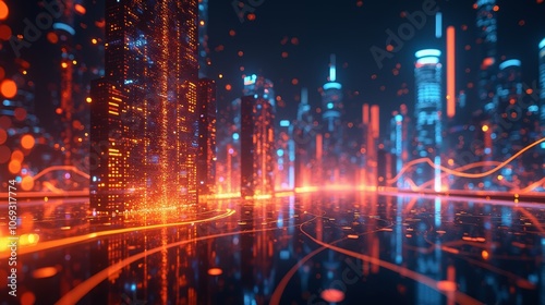A glowing, futuristic city with neon lights and illuminated pathways in orange and blue, creating a high-tech, sci-fi atmosphere.