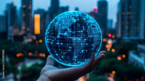 A glowing globe of the world, held in a hand, with city lights in the background.