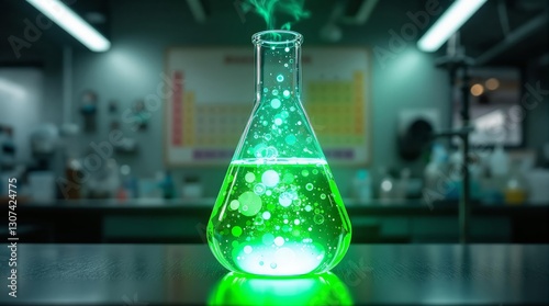 A glowing green flask filled with bubbling liquid, positioned in a laboratory setting.