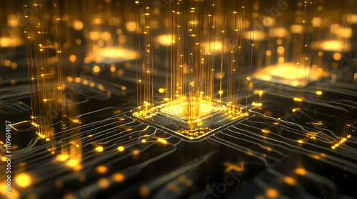 A glowing grid of golden vertical light beams emerging from a central point, representing data flow and futuristic technology.