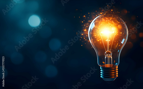 A glowing light bulb emits sparks, symbolizing innovation and creativity against a blurred blue background.