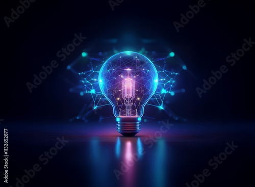 A glowing lightbulb, rendered in vibrant blue and pink hues, is encircled by a network of interconnected nodes, symbolizing innovation and connection. Its reflection shimmers on a dark, reflective su
