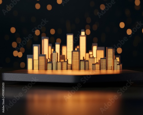 A glowing miniature city skyline with illuminated buildings set against a dark background, creating a warm and inviting atmosphere.