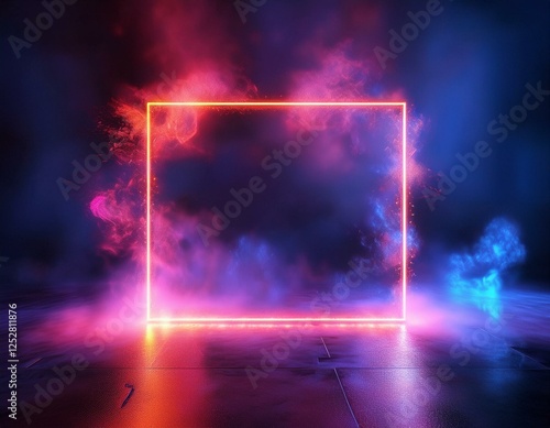 A glowing neon square frame on a dark background, with purple and blue light