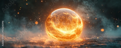 A glowing orb of energy illuminating a misty, dark surface, with vibrant lights and celestial sparks, resembling a powerful cosmic force