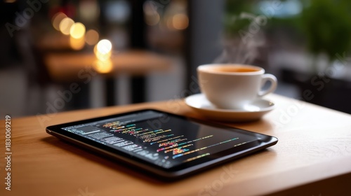 A glowing tablet screen displaying code in a dimly lit coffee shop, with a steaming cup nearby.