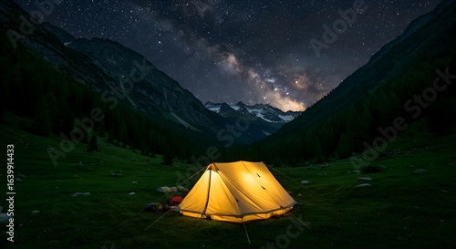 A glowing tent in a serene mountain valley under a starry night sky with the Milky Way visible, creating a peaceful atmosphere, AI Generated.