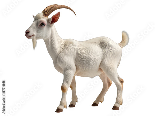 A goat with distinctive long horns standing on a white surface