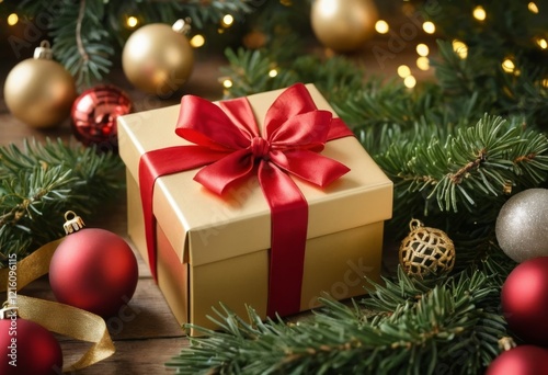 A Gold Christmas Gift Box with Red Ribbon Surrounded by Festive Ornaments and Pine Branches