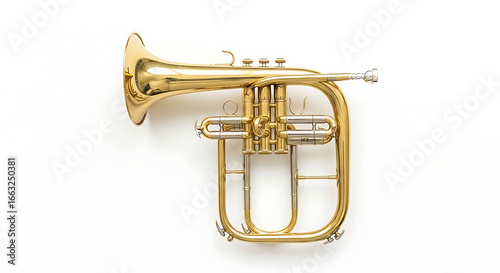 A golden flugelhorn lies on a white background with its valves and mouthpiece clearly visible to viewer ai generated