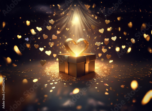 A golden gift box glows, emitting a radiant heart shape amidst a flurry of golden hearts and sparkles. Magical, romantic, and celebratory.
