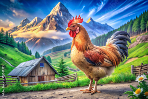 hen, chicken, bird, poultry, mountain, vale, sunset, dusk, gold, rock, sky, cloud, grass, field, landscape, nature, sun, ray, warm, colours, feather, beak, crest, red, brown, yellow, orange, light, scenic, rural, farm, animal, wildlife, outdoors, environment, beauty, peaceful, serene