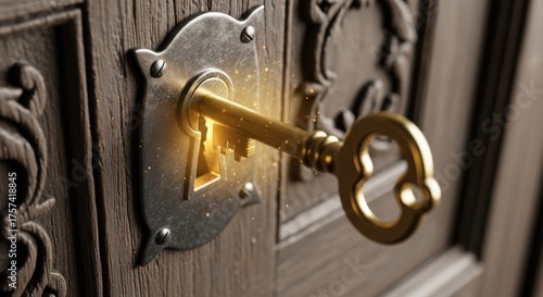 A golden key with a keyhole on a wooden door with intricate carvings.