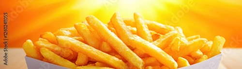 A golden pile of crispy French fries glistens under a bright, warm light, exuding a tempting and delicious appeal.
