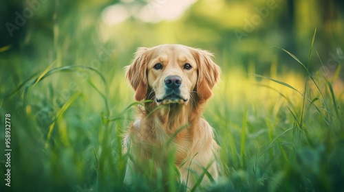 A golden retriever sits attentively in a lush green field, capturing a serene moment in nature.