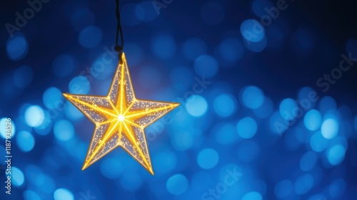 A golden star hangs against a backdrop of soft blue bokeh lights, a symbol of hope and celebration.