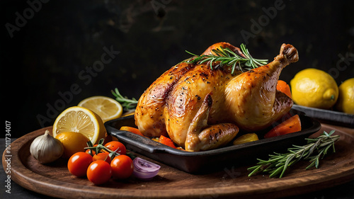 A golden-brown roasted chicken garnished with sprigs of rosemary, lemon wedges, and colorful vegetables, sitting on a rustic tray.