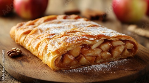 flaky, masterpiece, pastry, strudel, its, delicate, layer, symphony, apple, walnut, cinnamon, dusting, powdered, sugar, surface, single, gold, slice, taste, pure, bliss