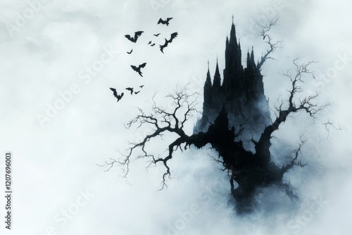 gothic, depiction, devil, tower, under, dark, stormy, sky, surrounded, eerie, mist, silhouetted, tree