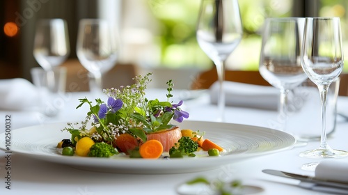 A gourmet dish with spring vegetables and herbs arranged beautifully on a fine dining table set for a seasonal tasting menu