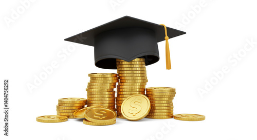 A graduation cap rests atop gleaming stacks of gold coins symbolizing the financial rewards of higher education and the pursuit of knowledge, brilliantly lit against a stark white background.