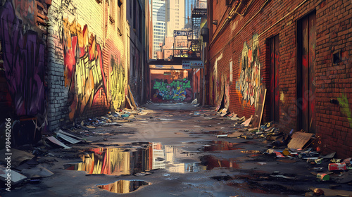 graffiti, covered, alleyway, puddle, water, middle, filled, trash, giving, run, down, abandoned, appearance, alley, illustration