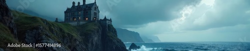 A grand, gothic-style house perched dramatically on a cliff overlooking a stormy sea The architecture is imposing, with dark stone and ominous shadows , stone, dramatic