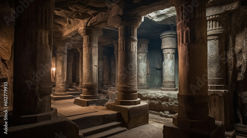 A grand underground chamber with towering columns and ancient ruins Generative AI