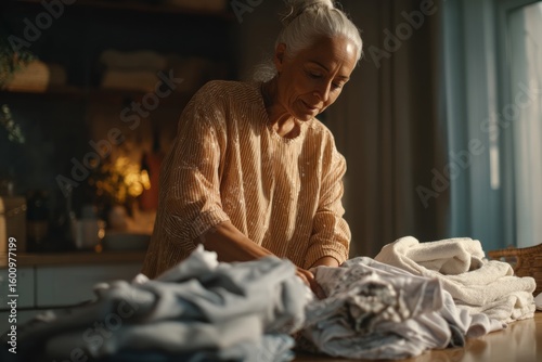 A grandmother enjoys her daily routine, folding freshly laundered clothes in a cozy home filled with warm light. The atmosphere radiates comfort and care as she meticulously organizes each item
