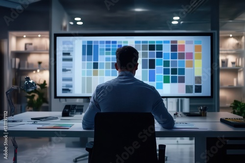 graphic, designer, modern, office, analysing, colours, palette, digital, sketch, large, screen, displaying, room, rendering