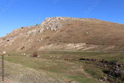 sky, grass, mountain, nature, hill, hillside, lush, land, highland, landscape, mountain, rock, travel, summer, desert, cloud, view, vale, hill, stone, peak, scenic, tour tourism, countryside, dry, blue, cloud