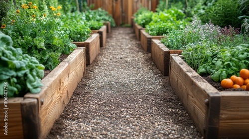 A gravel pathway leads through a lush raised garden bed with rows of fresh herbs and vegetables.