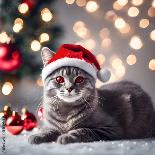 A gray cat at Christmas time, wearing a red Santa hat, a calm face and sparkling eyes, with Christmas decorations and beautiful lights beside it.