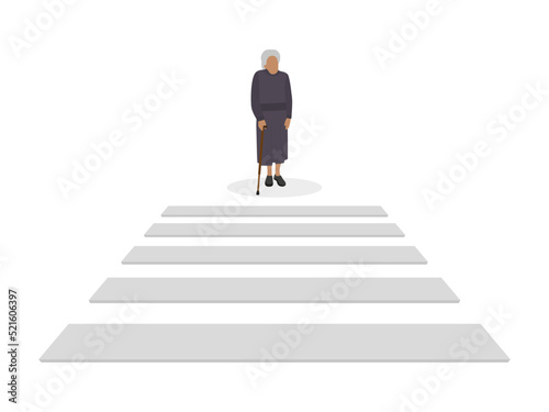 A gray-haired old woman with a cane stands in front of a pedestrian crossing on a white background