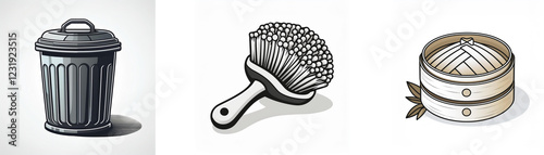 bamboo, basket, bristle, broom, brush, cleaning, container, cooking, cookery, design, dim sum, dish, domestic, drawing, food, garbage, graphic, greyscale, grey, handle, household, hygiene, illustration, image, kitchen, lid, metal, monochrome, object, oriental, picture, preparation, receptacle, round, serving, silver, stack, steamer, tidy, tool, utensil, waste, wicker