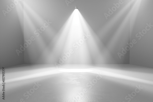 A grayscale image of a spotlight illuminating an empty studio room, setting a stark, modern concept on a blank background. Generative AI