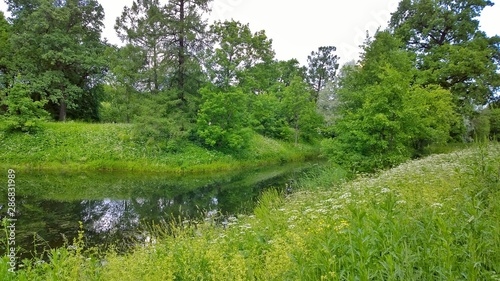 A great place to relax is Farm Park in Pushkin, a suburb of St. Petersburg, Russia. Green grass, trees and reflection in the pond. The concept of happiness of life and inspiration