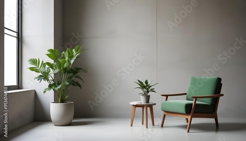 A green armchair in a minimalist room with a concrete wall and a small potted plant on a wooden side table