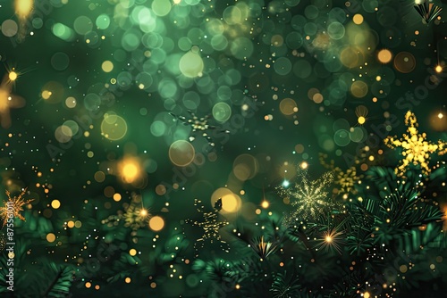 A green background with a lot of sparkles and snowflakes. The snowflakes are scattered all over the background and are of different sizes