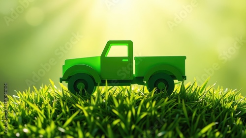 A Green Pickup Truck Model in a Lush Meadow Representing Environmental Awareness and Sustainable Transportation