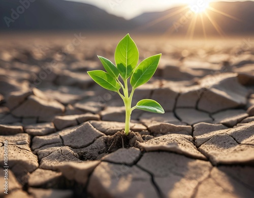 A green plant emerges from cracked earth, symbolizing resilience and hope in a harsh environment.