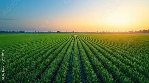 A green rice field with a sunset in the background
