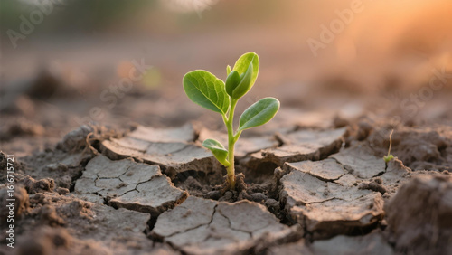 A green seedling grows from cracked earth, symbolizing resilience and hope.