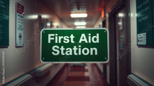 A green sign with the words 'First Aid Station' is in a hallway with the lights on the ceiling.