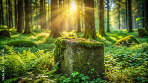 A green-gray stone stand placed in a wild, overgrown forest, with sunlight dappling through the leaves, highlighting the natural beauty of the scene, ideal for cosmetic mockups.